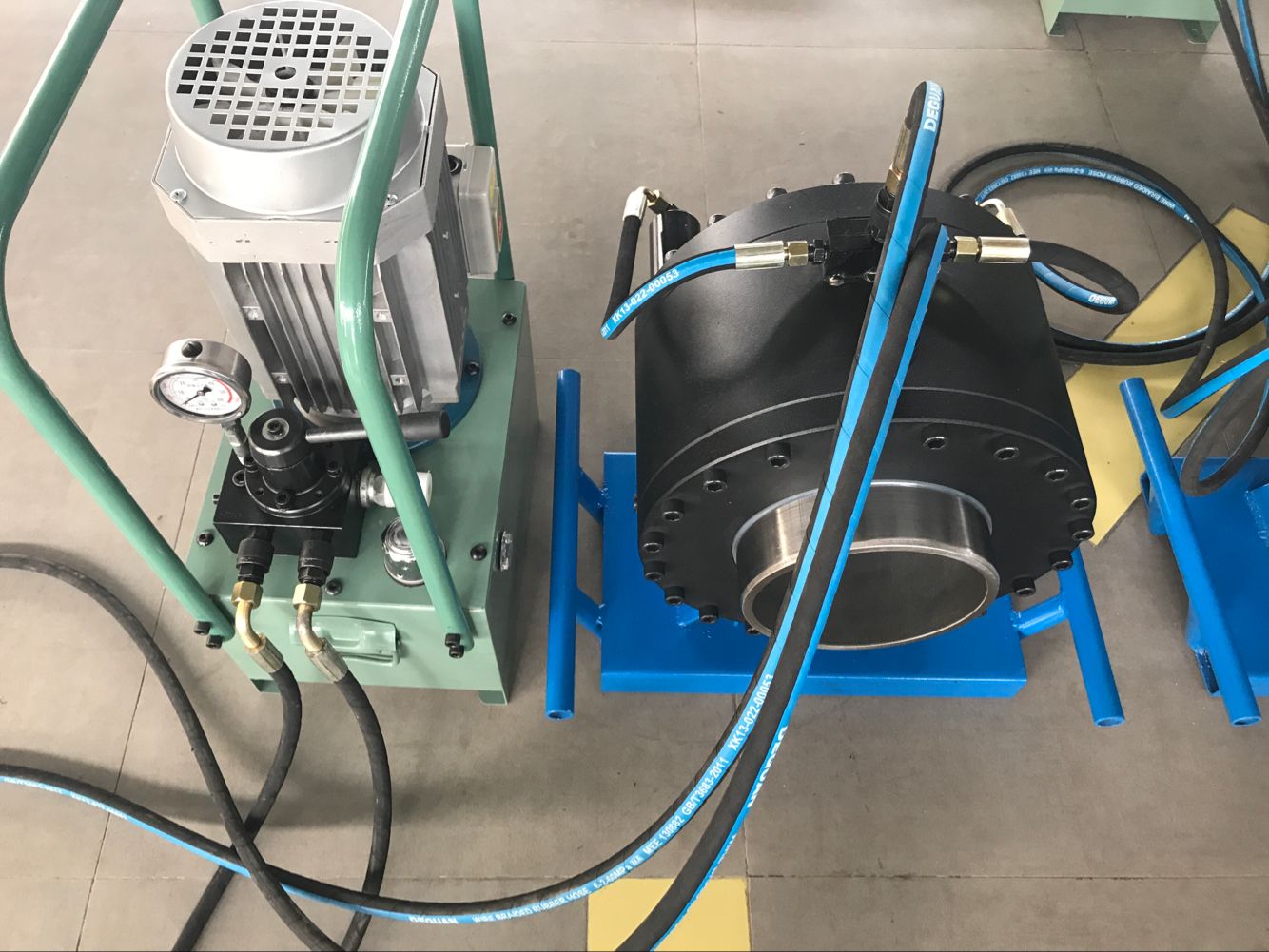 一、壓管機(jī)工作原理油泵安裝于油箱內(nèi)浸泡在液壓油里達(dá)到科學(xué)散熱靜音的設(shè)計(jì)目的,油泵在電機(jī)驅(qū)動(dòng)下,輸出液壓油,推動(dòng)扣壓油缸內(nèi)的柱塞運(yùn)動(dòng),致使模座徑向收縮,實(shí)現(xiàn)模具對(duì)膠管接頭外套的擠壓。當(dāng)收縮量達(dá)到千分尺預(yù)定值時(shí),擠壓自動(dòng)停止,電磁換向閥換向后,油缸內(nèi)的柱塞反向運(yùn)動(dòng),模具隨之張開,扣壓膠管完成。二、壓管機(jī)安裝調(diào)試搬運(yùn):壓管機(jī)適宜采用叉車搬運(yùn),并以壓管機(jī)底部受力,壓管機(jī)嚴(yán)禁倒置。嚴(yán)禁搬抬壓管機(jī)頭及電機(jī)、電器箱部位。安裝:壓管機(jī)需水平放置在穩(wěn)固的地基上,并作接地處理。注油:打開油箱蓋,油箱中加入68#抗磨液壓油到油位表2/3位置。接電:將電源線接在壓管機(jī)規(guī)定的電源上,啟動(dòng)電機(jī)觀察轉(zhuǎn)向,電機(jī)轉(zhuǎn)向應(yīng)與電機(jī)所…