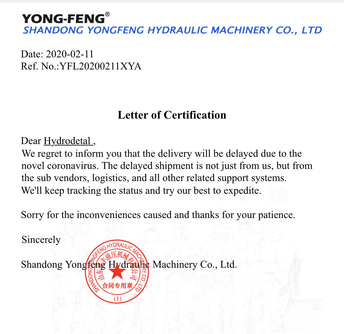 尊敬的客戶:我們很遺憾地通知您,由于新型冠狀病毒的防疫工作,永豐液壓交貨將延遲。延遲發(fā)貨的原因不僅僅來自我們,還來自分供應(yīng)商、物流和所有其他相關(guān)支持系統(tǒng)。我們會(huì)繼續(xù)追蹤情況,盡力加快速度。給您帶來的不便敬請(qǐng)諒解,謝謝您的耐心。…